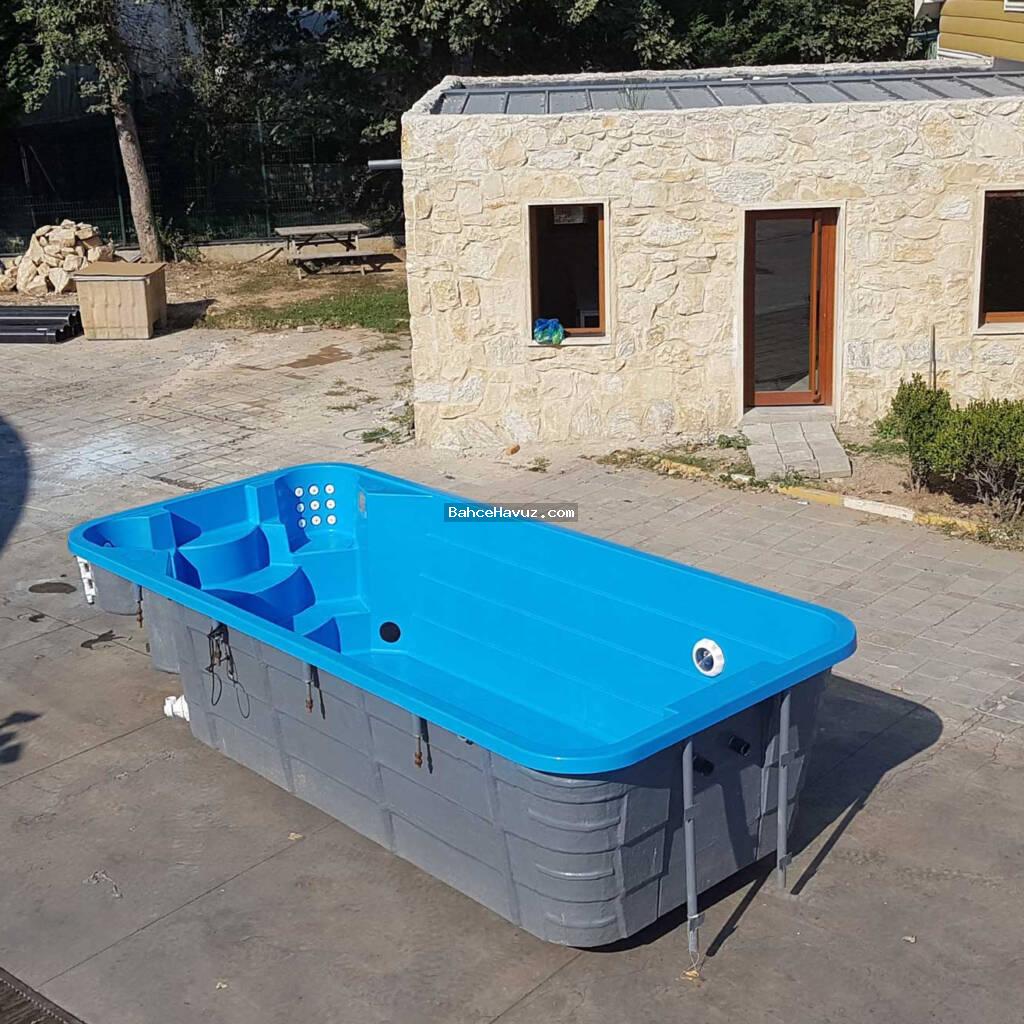 Monoblok hazır havuz Boyutlar: 2,40 x 5,20 mt Yükseklik: 1,50 mt Su Derinliği: 1,40 mt Merdiven: Var Jakuzi: Var Gövde: Cam elyaf takviyeli polyeste