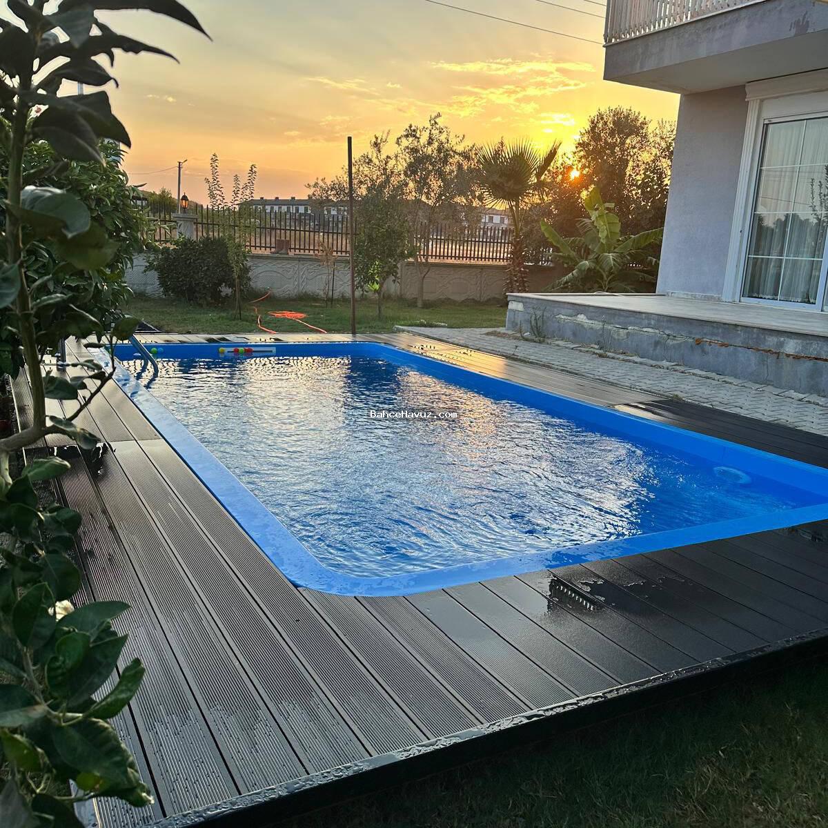 Riva model fiberglass polyester prefabrik yüzme havuzu, tüm havuz içi ve kenar ekipmanları, tesisat, aydınlatma, makine dairesi ve temizlik setiyle birlikte komple anahtar teslim olarak teslim edilmektedir. Havuzumuzun boyutları 320 cm * 620 cm'dir.